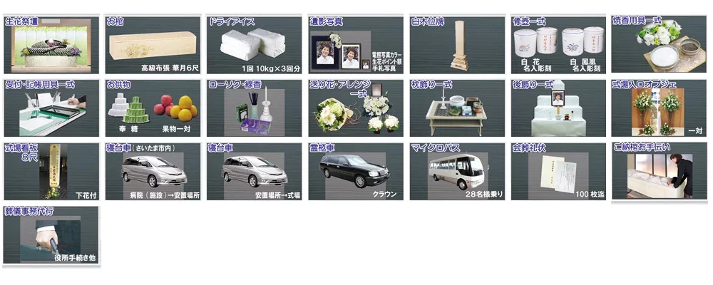 ハイグレードプラン(シンビジウムプラン) ハイグレードのおもてなし、生花祭壇・霊柩車等も含む好評のプランです。 プラン内容 価格 ¥1,200,000~(税込¥1,320,000) ※お布施・火葬料・お食事代・返礼品は別途となります。 プランに含まれるもの 生花祭壇カタログ こちらのプランで選択できる生花祭壇の一部をご紹介いたします。 こちらに掲載しております他にも多数ご用意しておりますので、ご希望などございましたらお気軽にお問い合わせくださいませ。